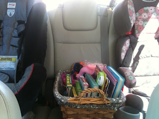 We also have a DVD player in the car (that I am soooo grateful for!), but sometimes my kiddos get bored. Luke LOVES to look through books. I have a basket stuck between their car seats will with books, small, toys, and coloring stuff.